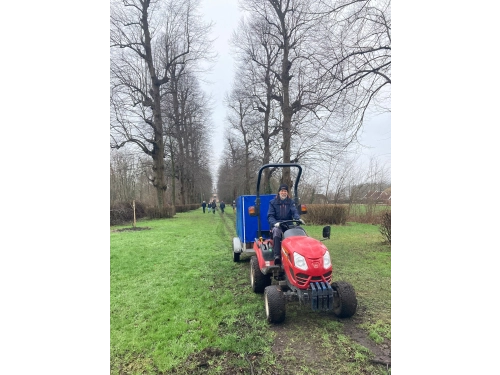Voor deze oogstdag moet tamelijk veel gelopen worden. Van de verzamelplek tot aan de oogstlocatie is het ongeveer 1 km door het park en langs de weilanden. We hebben een tractor met aanhanger tot onze beschikking, dus we hoeven niet te sjouwen met materieel en zaailingen.